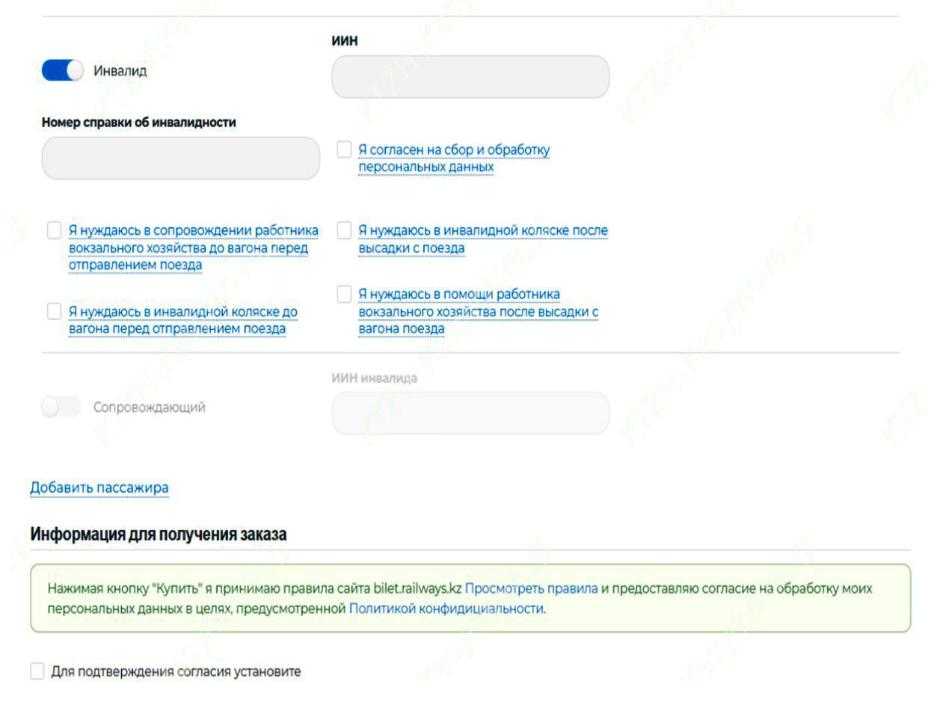 2. Сатып алу барысында «Мүгедек» опциясын таңдап, ЖСН мен мүгедектік туралы анықтаманың нөмірін көрсету;