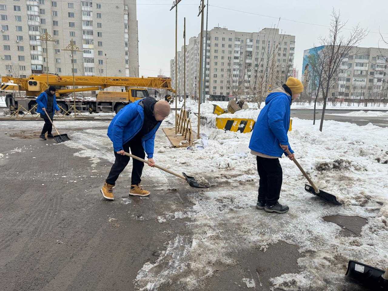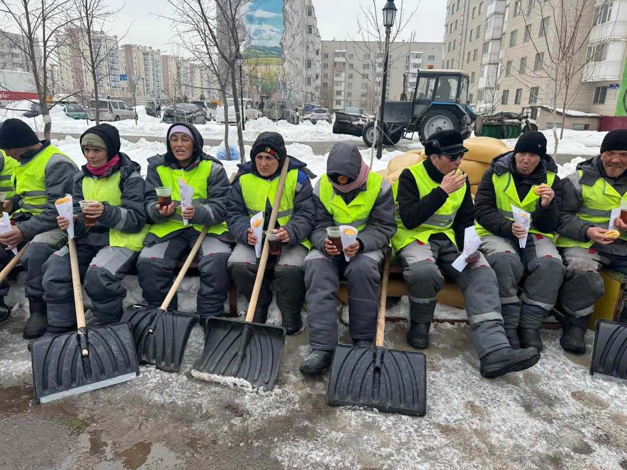 Акция аясында еріктілер коммуналдық қызмет жұмысшыларын ыстық бауырсақ пен шайдан дәм татқызды. Сонымен қатар волонтёрлар күрек алып, аумақты тазалауға атсалысты.